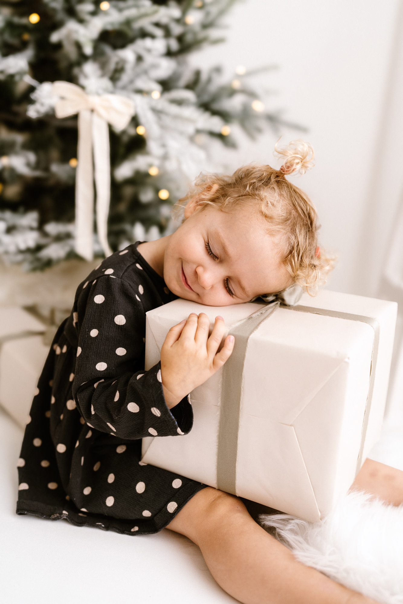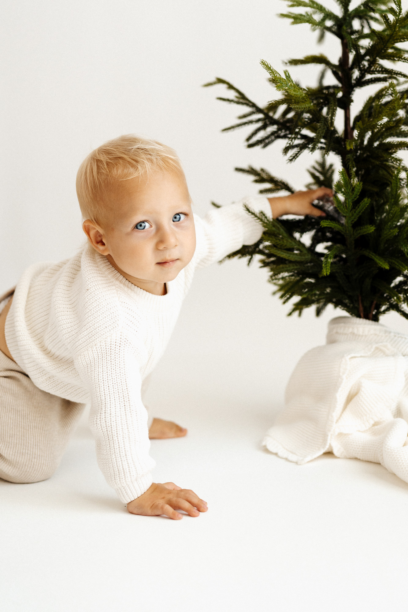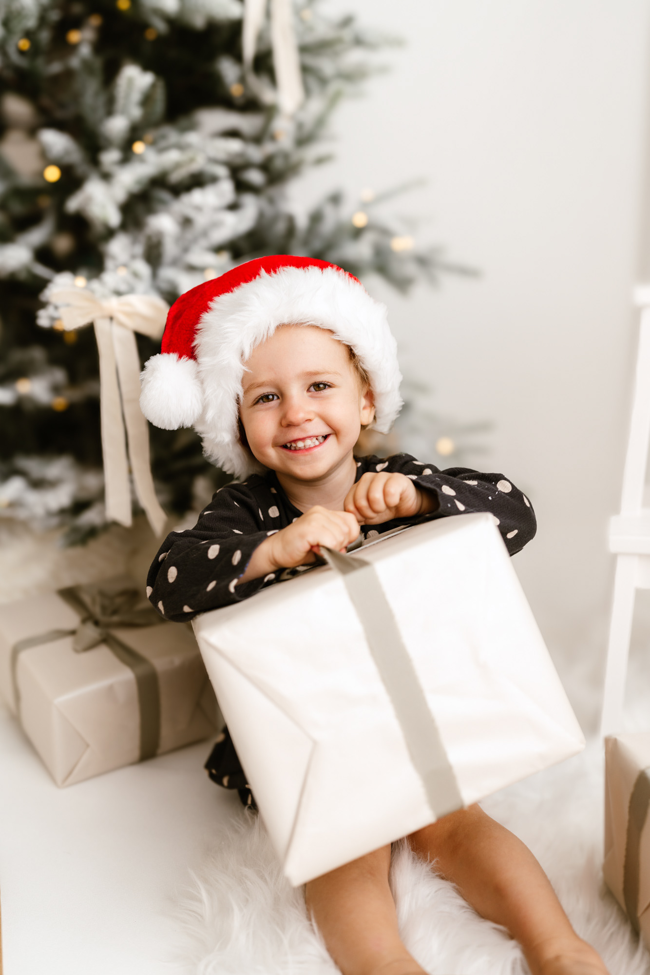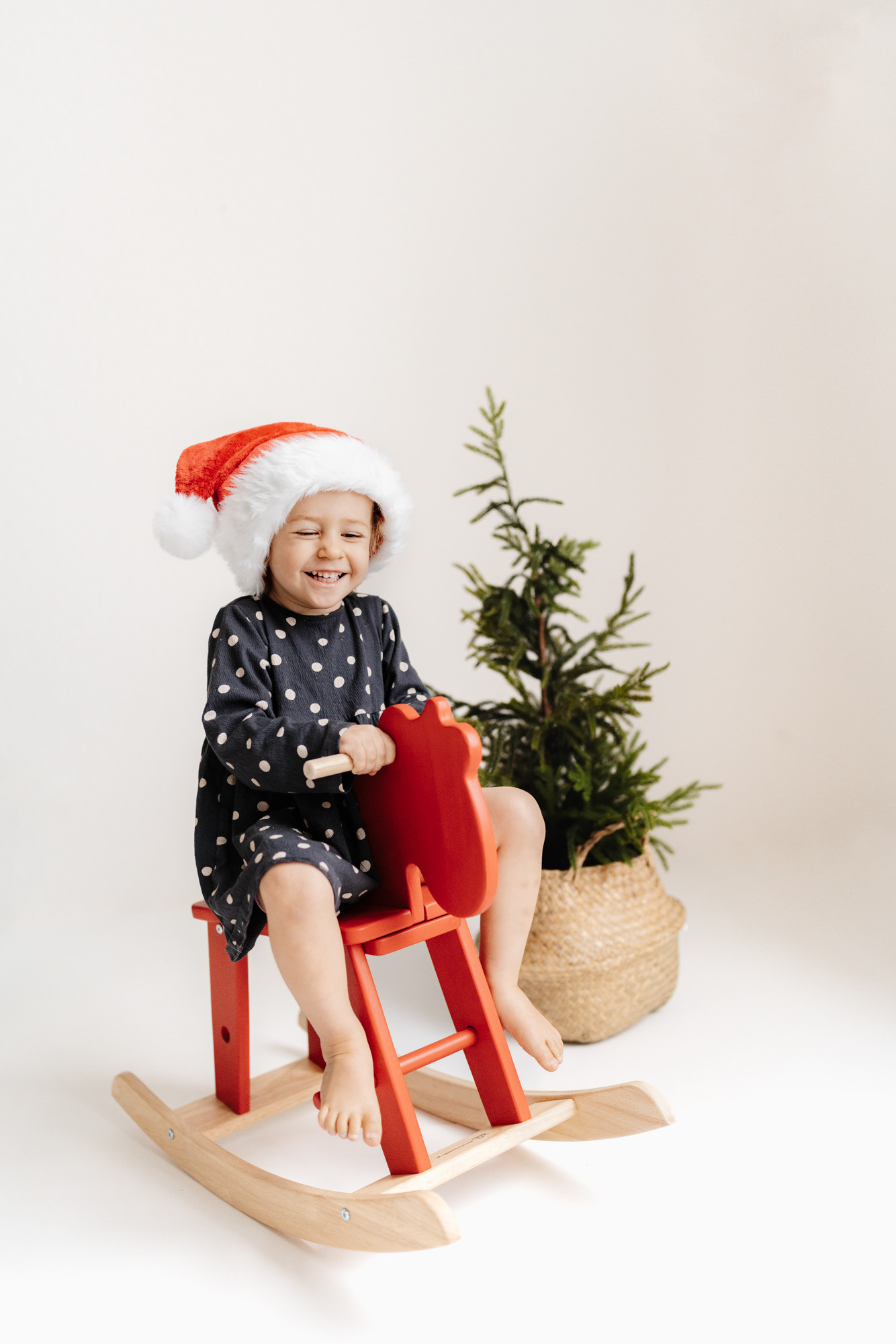 These sessions feature a highly customizable setup: a clean white background for a timeless look, with the option to choose from simple props — Christmas trees, ornaments, wreaths, a rocking horse, presents, and a selection of seating options — to create charming, minimalist-style images tailored to your taste.