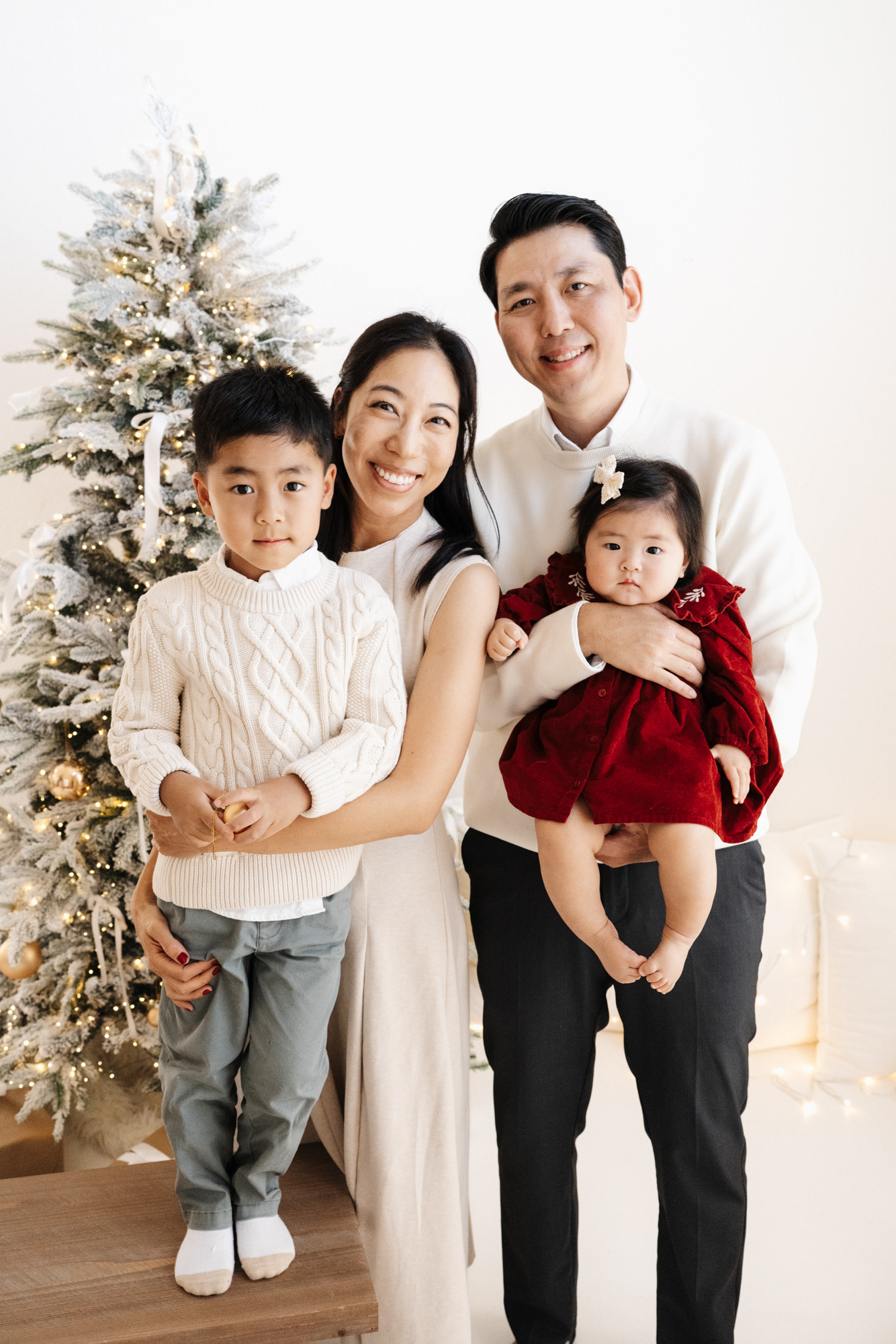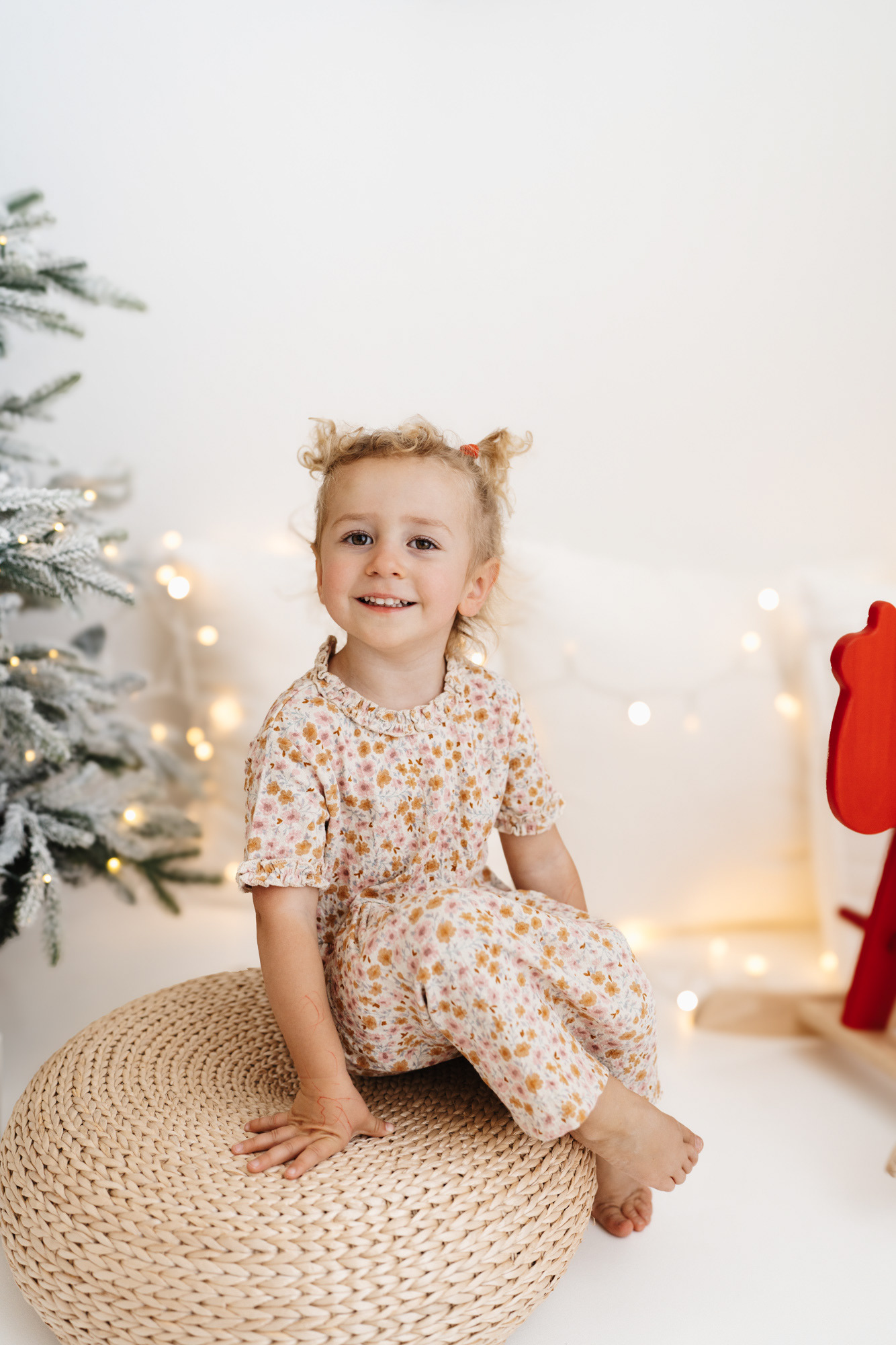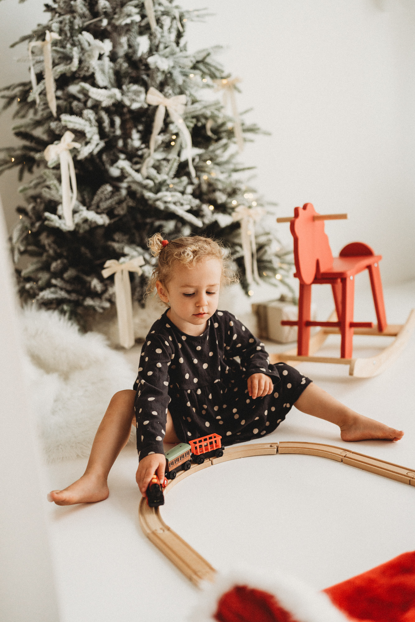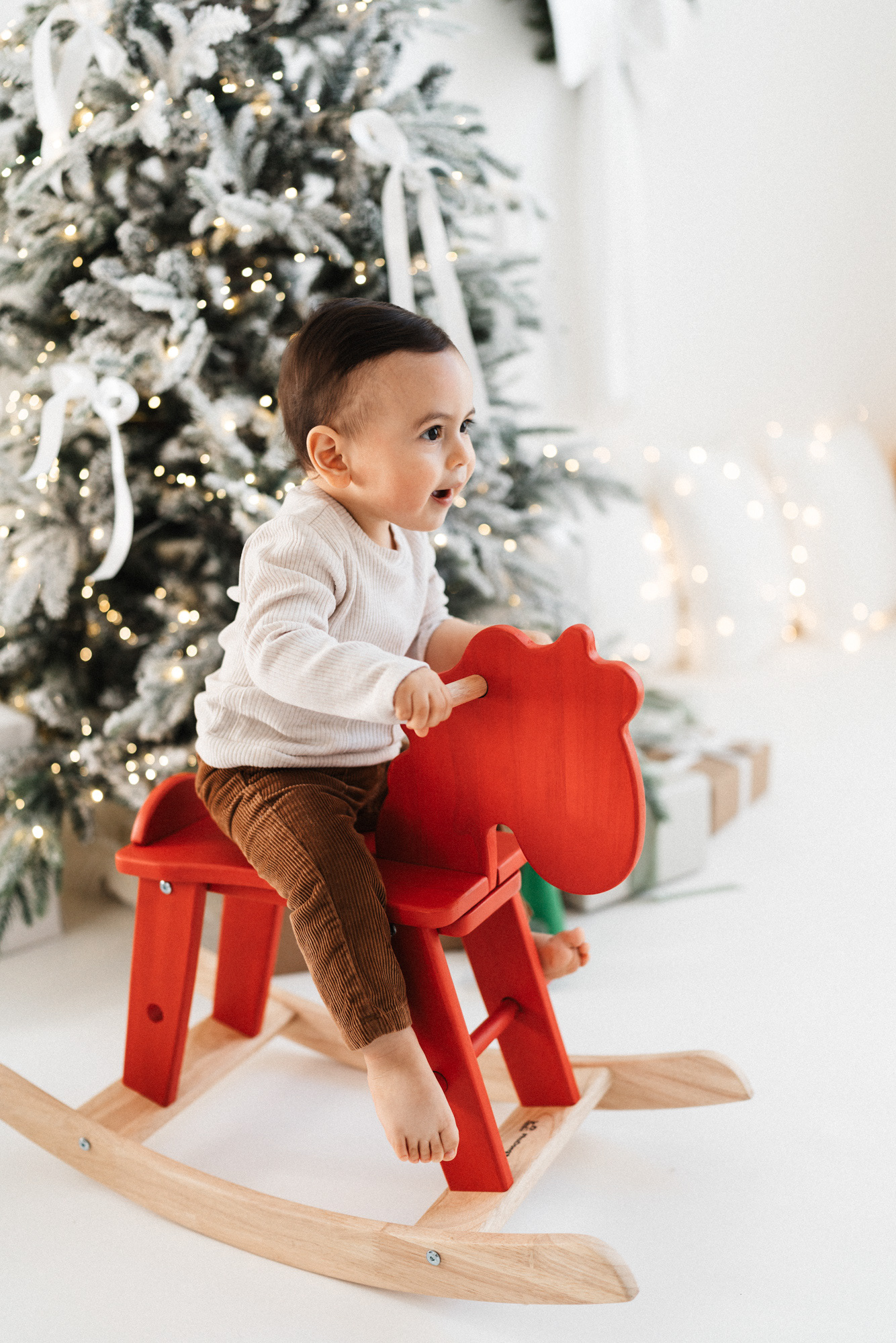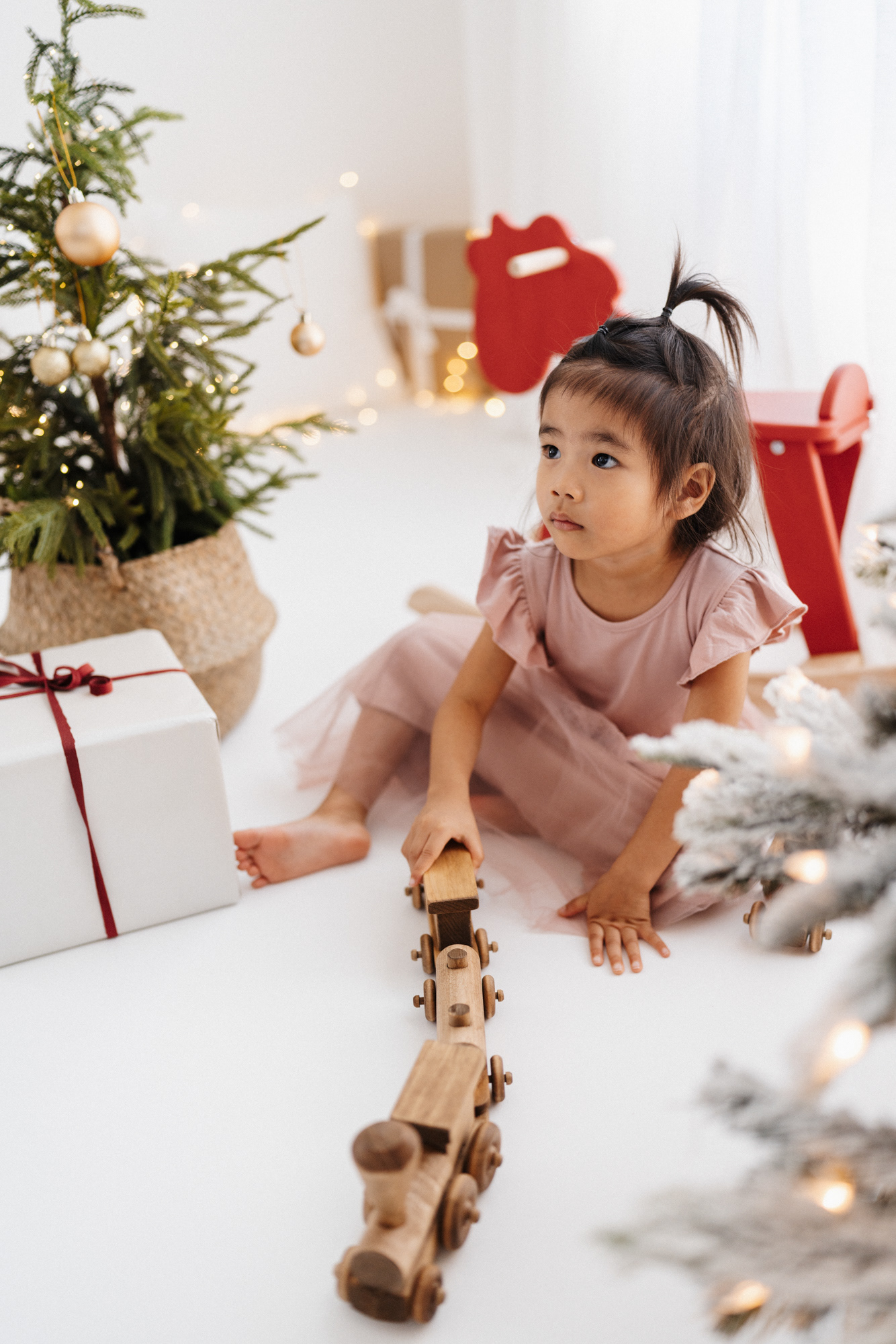 These sessions feature a highly customizable setup: a clean white background for a timeless look, with the option to choose from simple props — Christmas trees, ornaments, wreaths, a rocking horse, presents, and a selection of seating options — to create charming, minimalist-style images tailored to your taste.