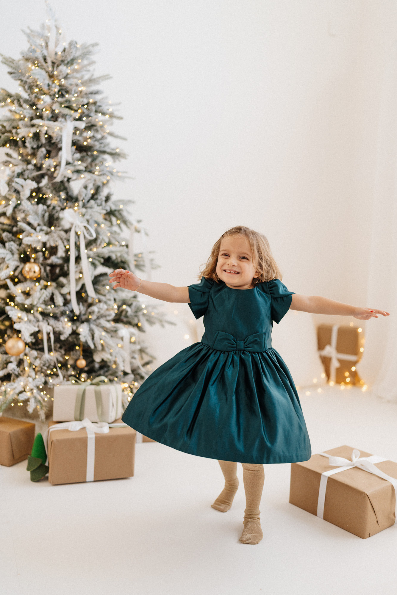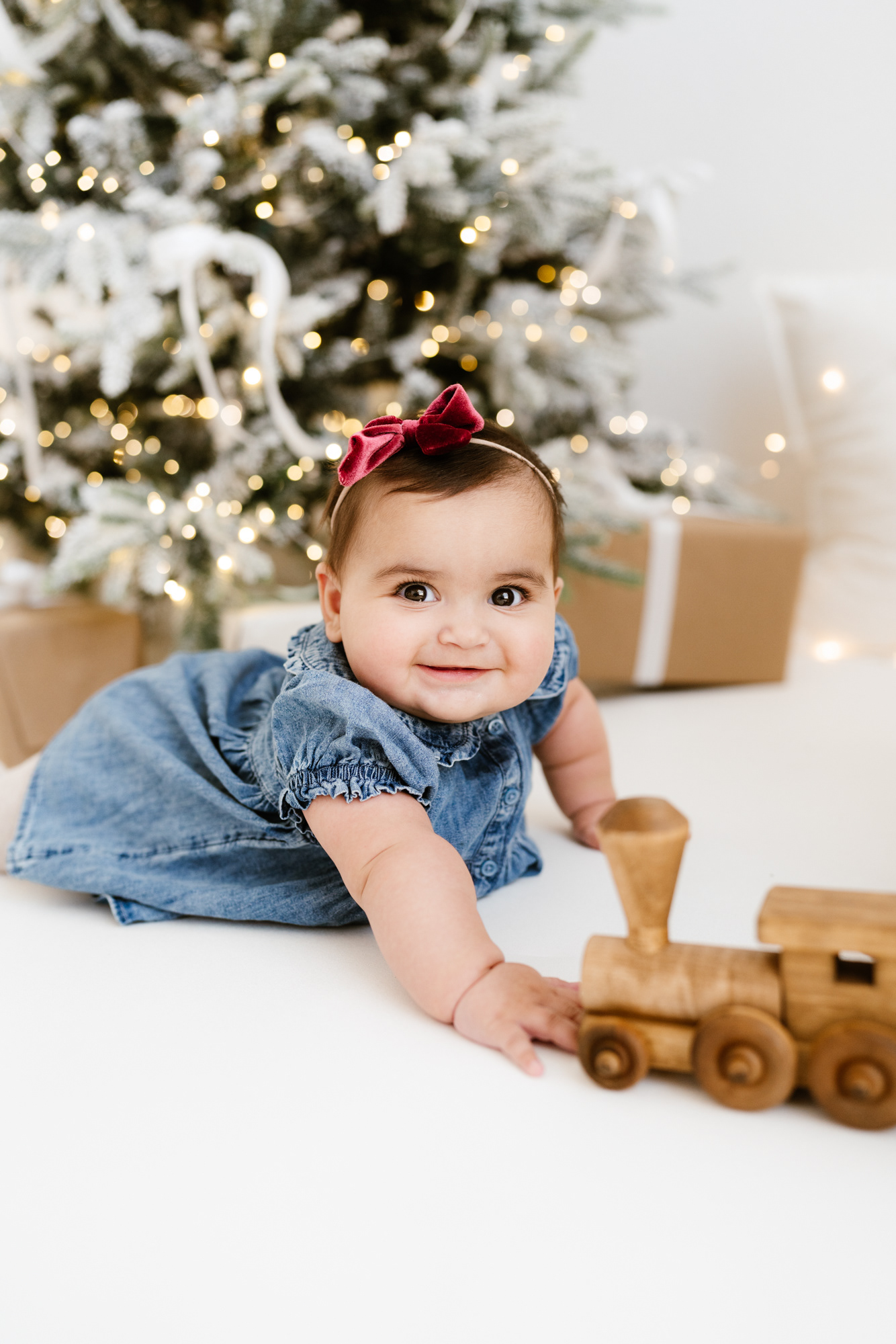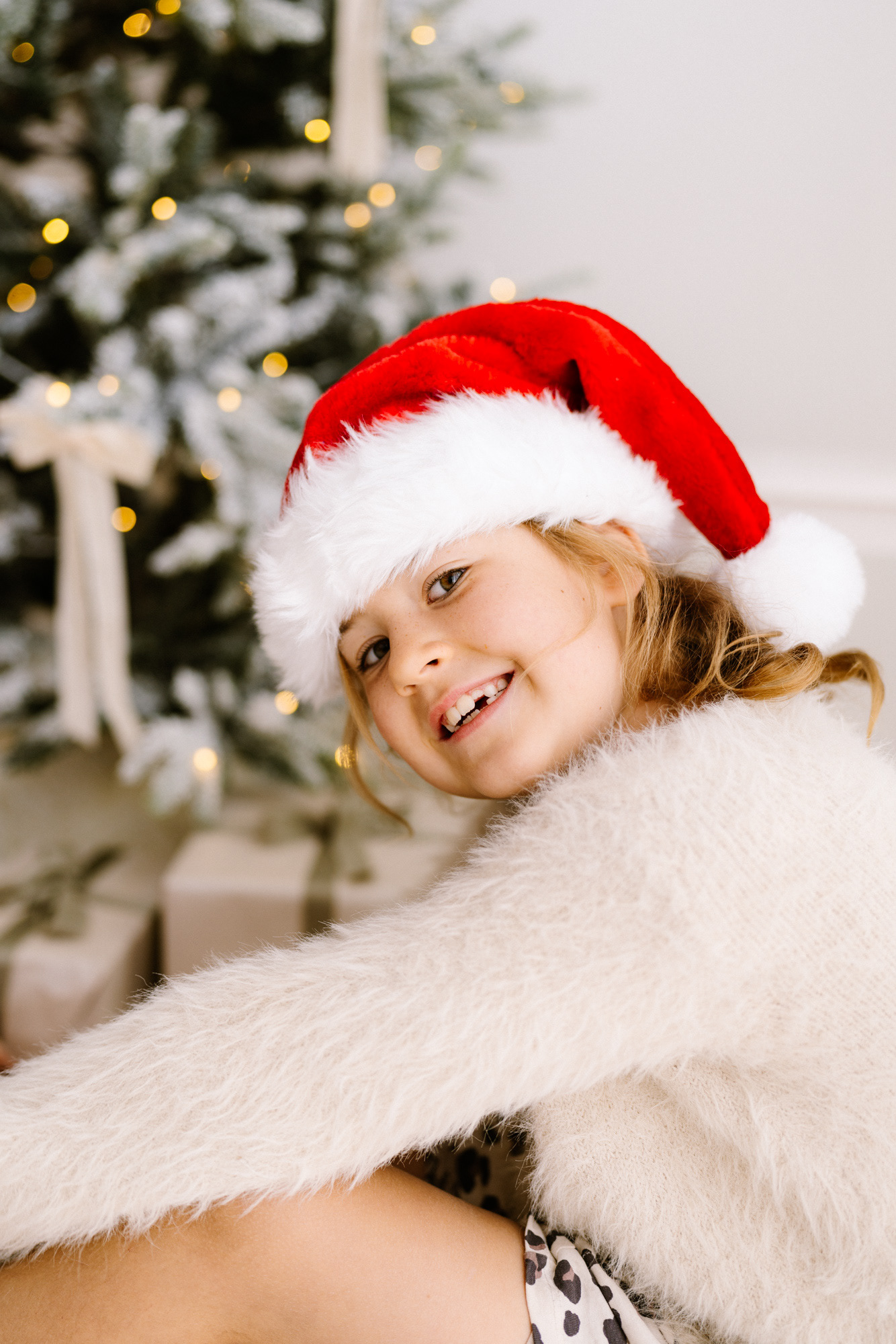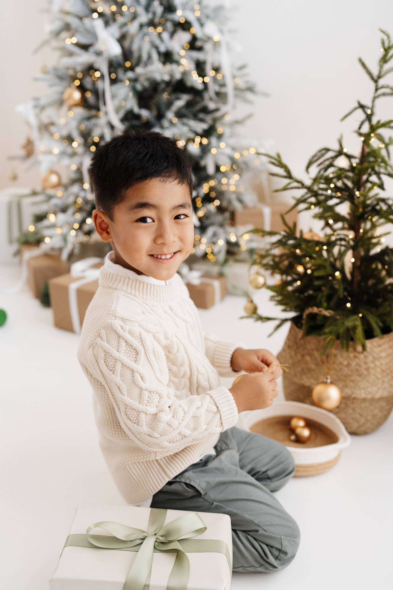 These sessions feature a highly customizable setup: a clean white background for a timeless look, with the option to choose from simple props — Christmas trees, ornaments, wreaths, a rocking horse, presents, and a selection of seating options — to create charming, minimalist-style images tailored to your taste.