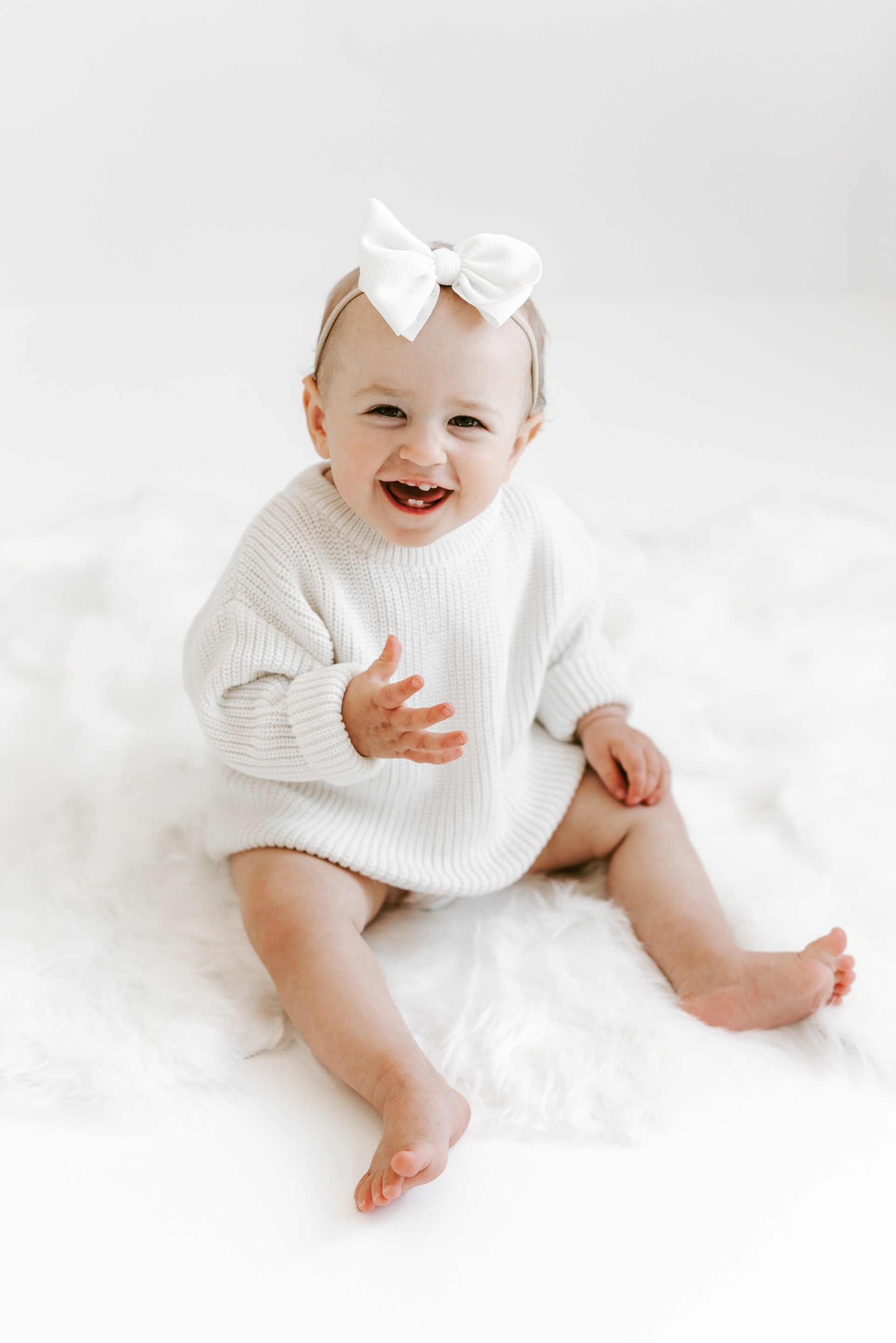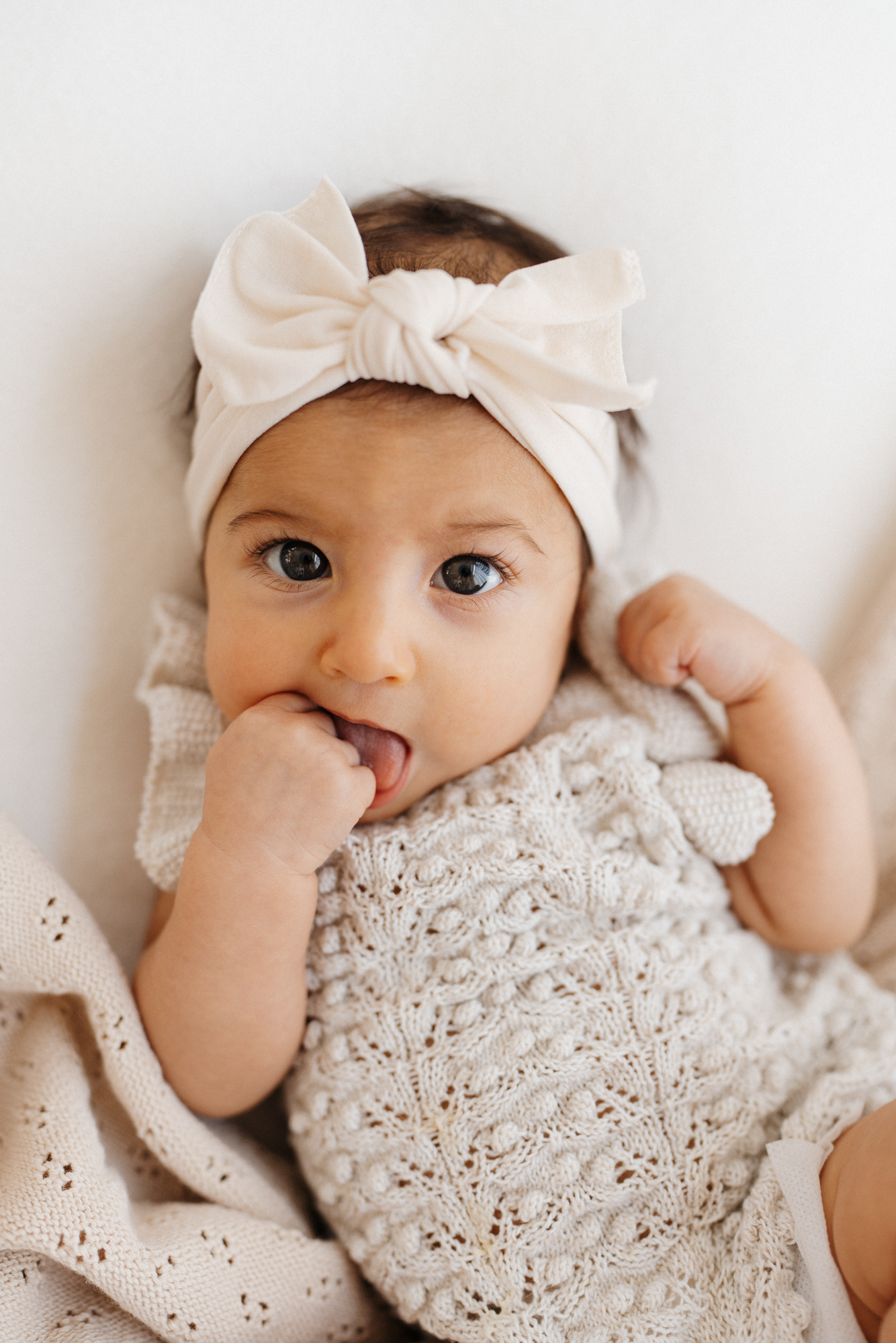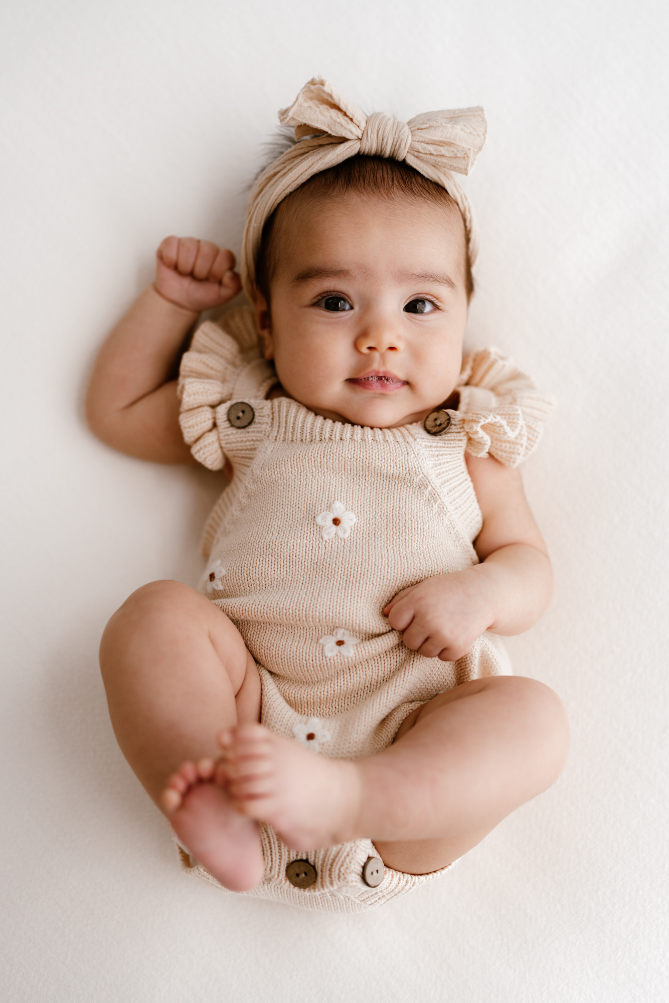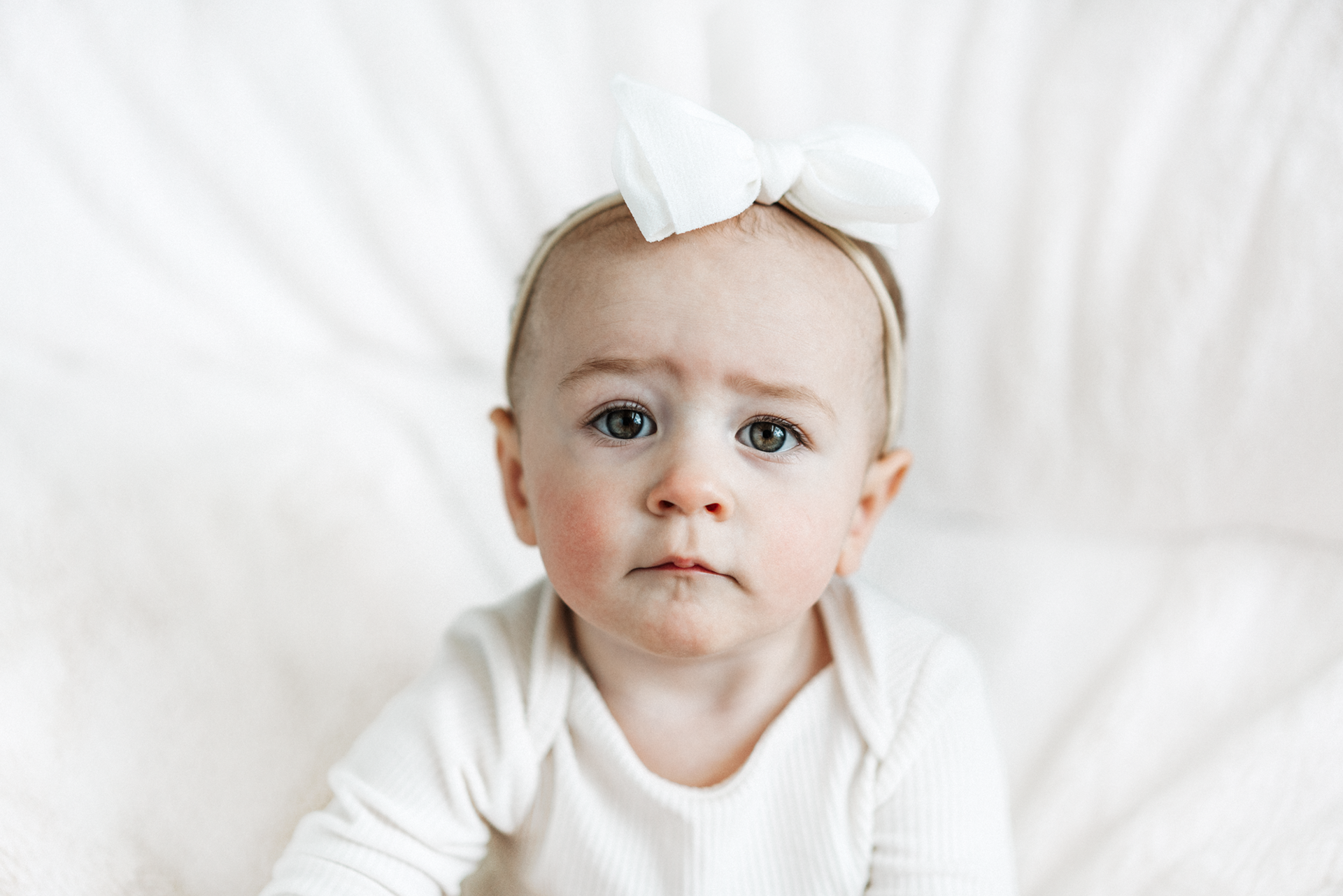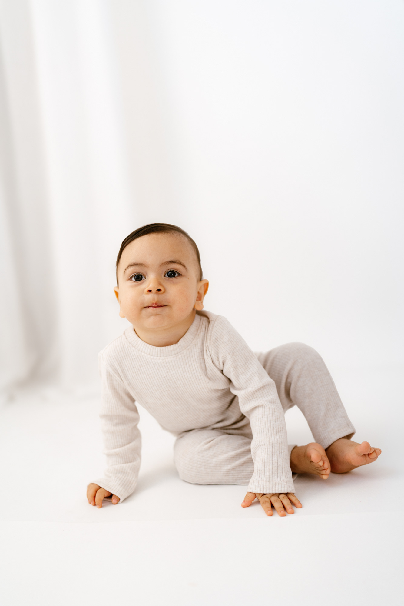 If you’ve already done newborn photos, some especially lovely milestones to consider are around 3–4 months, when babies are more alert, making eye contact and starting to show those first smiles, and around 8–9 months, when they can typically sit up unassisted and their personalities really begin to shine.